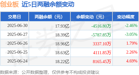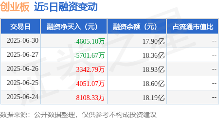 本站消息,6月30日,创业板(159915)融资买入2.23亿元,融资偿还2.69亿元,融资净卖出4605.1万元,融资余额17.9亿元。